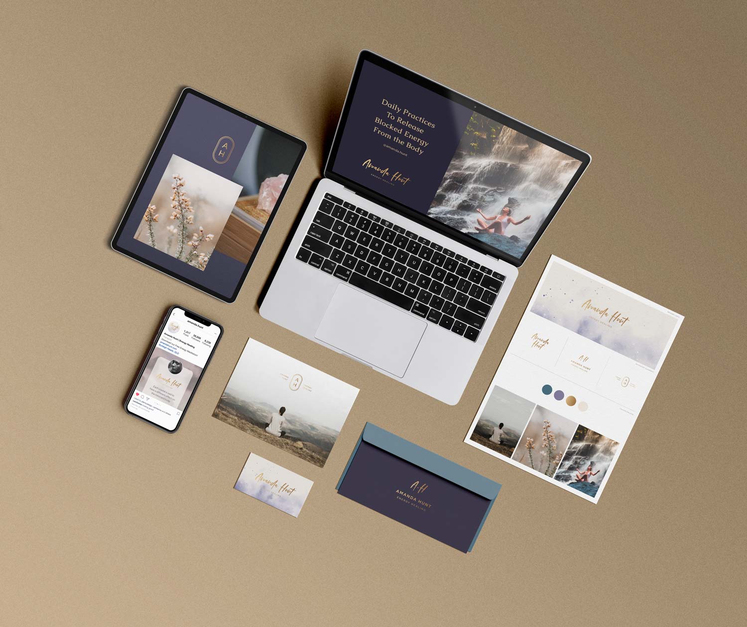 Amanda Hunt is a passionate energy healer and reiki therapist. The brand designed for her brings up a mystical and sophisticated look. This is passion project created for a hypothetical energy healing studio.